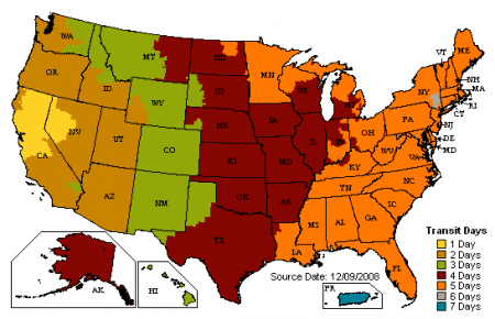 We ship via United Parcel Service, so shipping times are fairly predictable with the exception of unexpected weather-related delays. A map of shipping times for the continental United States is HERE.